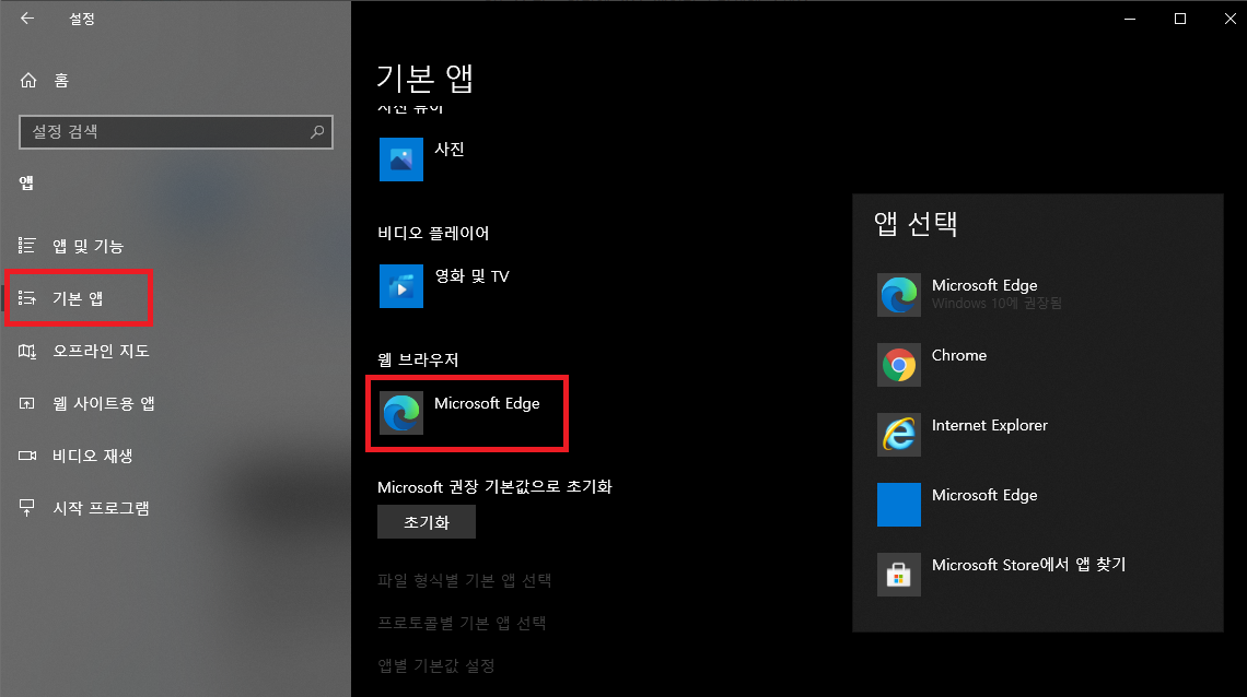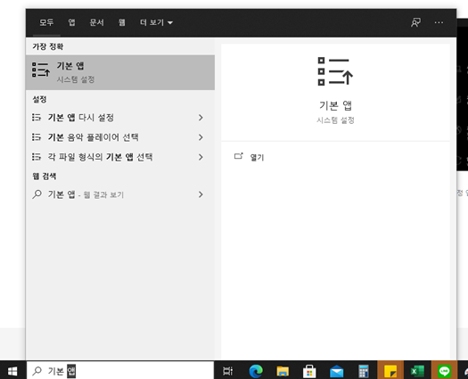다른 방법으로는 검색창에 "기본 앱"을 검색하시면 바로 설정 화면으로 접속이 가능합니다.