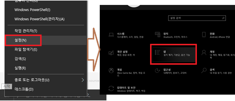 왼쪽 아래 윈도우마크를 마우스 우클릭 -> 설정 -> 앱