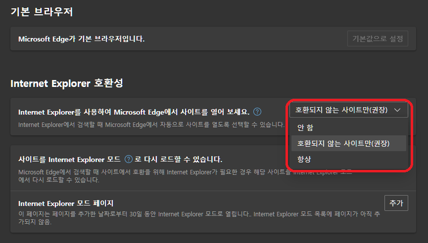 제가 일반적으로 사용하는 설정은 엣지를 기본 브라우저로 사용하면서 "호환되지 않는 사이트만(권장)"설정을 지정해 놓았습니다.