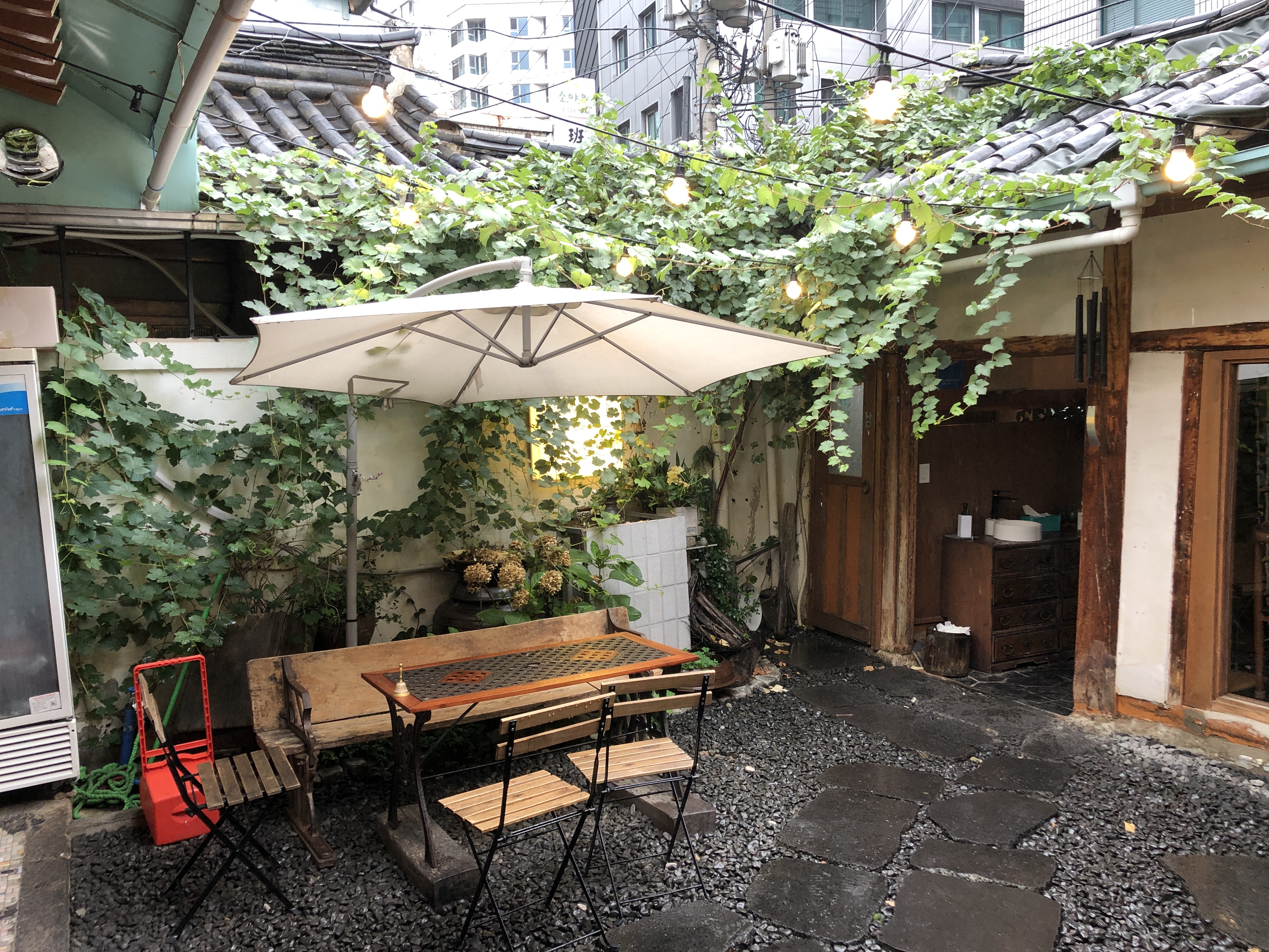 가운데 마당?중정?에는 테이블이있어 고즈넉한 분위기였습니다. 비가 내리지 않았다면 마당에 테이블도 좋았을 거 같아요. 아니면 마당을 볼 수 있는 창가의 자리도 추천드립니다.
