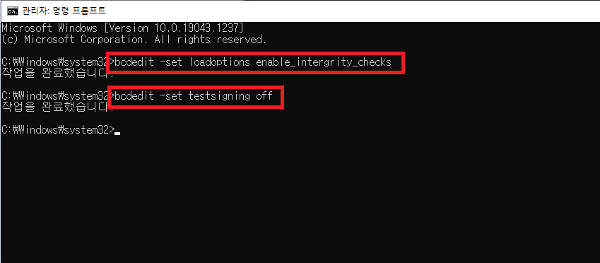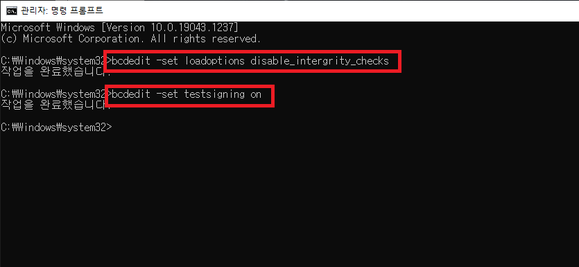testsigning on : 테스트 모드를 작동시키는 명령어