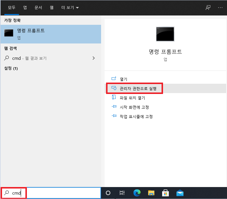 윈도우 좌측 아래 돋보기(검색) 창에서 cmd 또는 명령 프롬프트라고 검색하시고 우측 메뉴에서 "관리자 권한으로 실행"을 선택해주세요.
