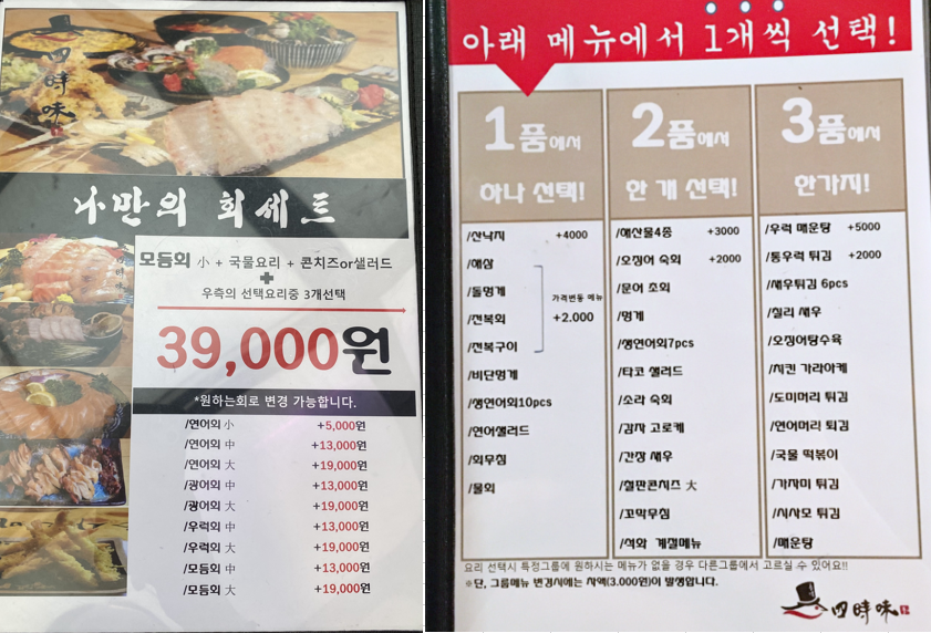 이렇게 선택했습니다. 사장님께서 모둠회에 생연어회가 포함돼있으니 다른 메뉴를 추천해주셨는데요..