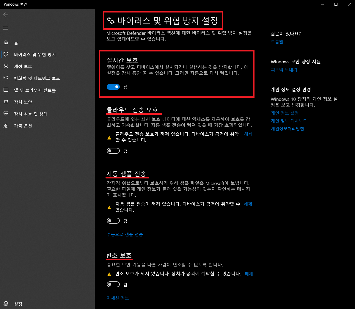 추가적으로 클라우드 전송 보호, 자동 샘플 전송, 변조 보호 설정 역시 종료해주세요.