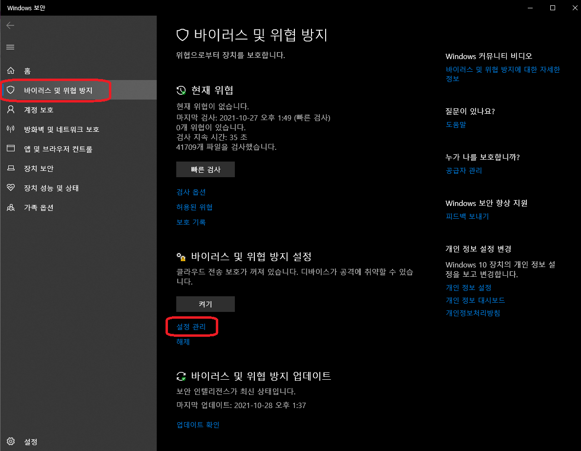 바이러스 및 위협 방지 탭에서 '설정 관리'를 선택해줍니다.