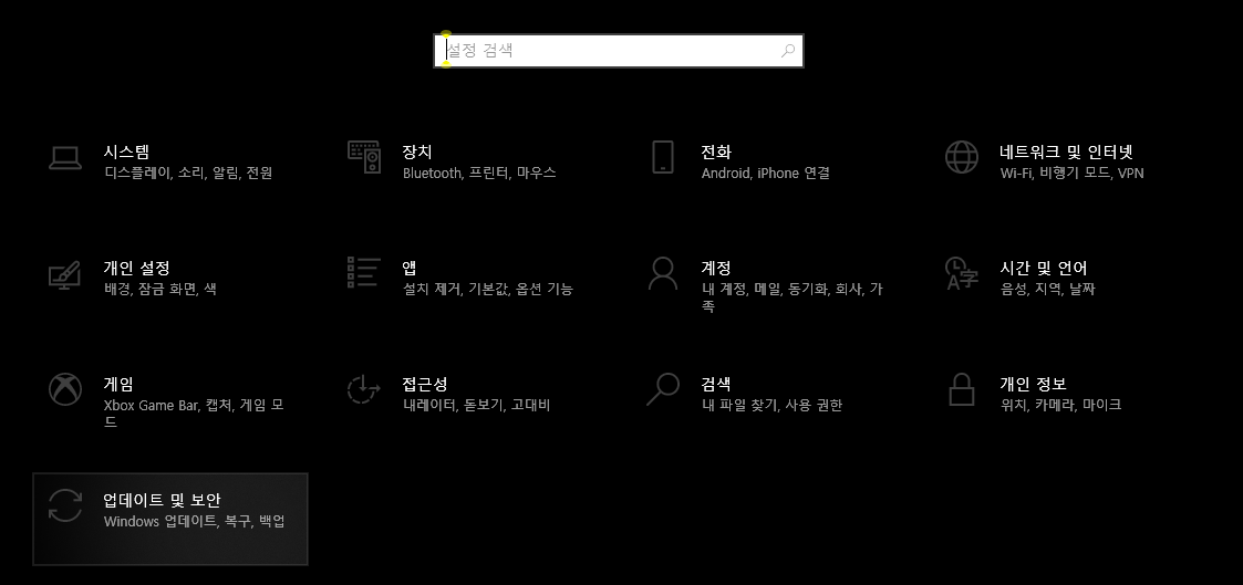 여기서 '업데이트 및 보안' 메뉴를 선택해주세요.