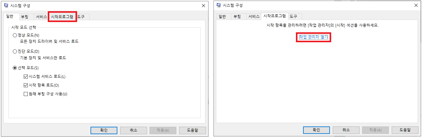 상단 메뉴에서 시작프로그램 하위 메뉴에서 작업 관리자 열기를 클릭해주세요.