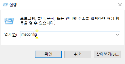 그리고 다음과 같이 msconfig 를 입력하시고 확인을 눌러주세요.