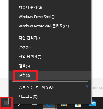 윈도우 로고를 마우스 우클릭 그리고 실행(R)을 눌러줍니다.