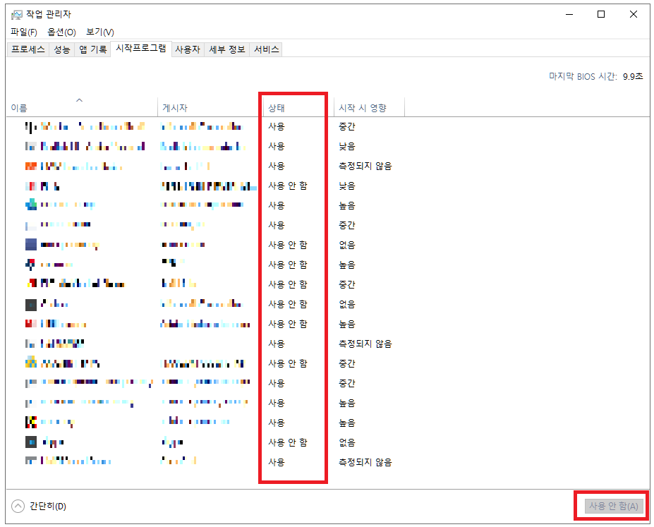 그리고 원하는 프로그램을 선택 후 우측 아래 사용 안 함을 눌러주시면 됩니다.
