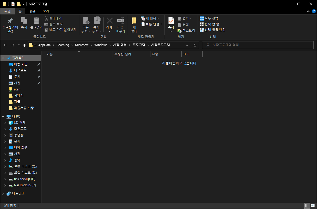 이 폴더에 윈도우 부팅 시 실행시키고 싶으신 파일, 프로그램을 옮겨주시면 끝이 납니다.