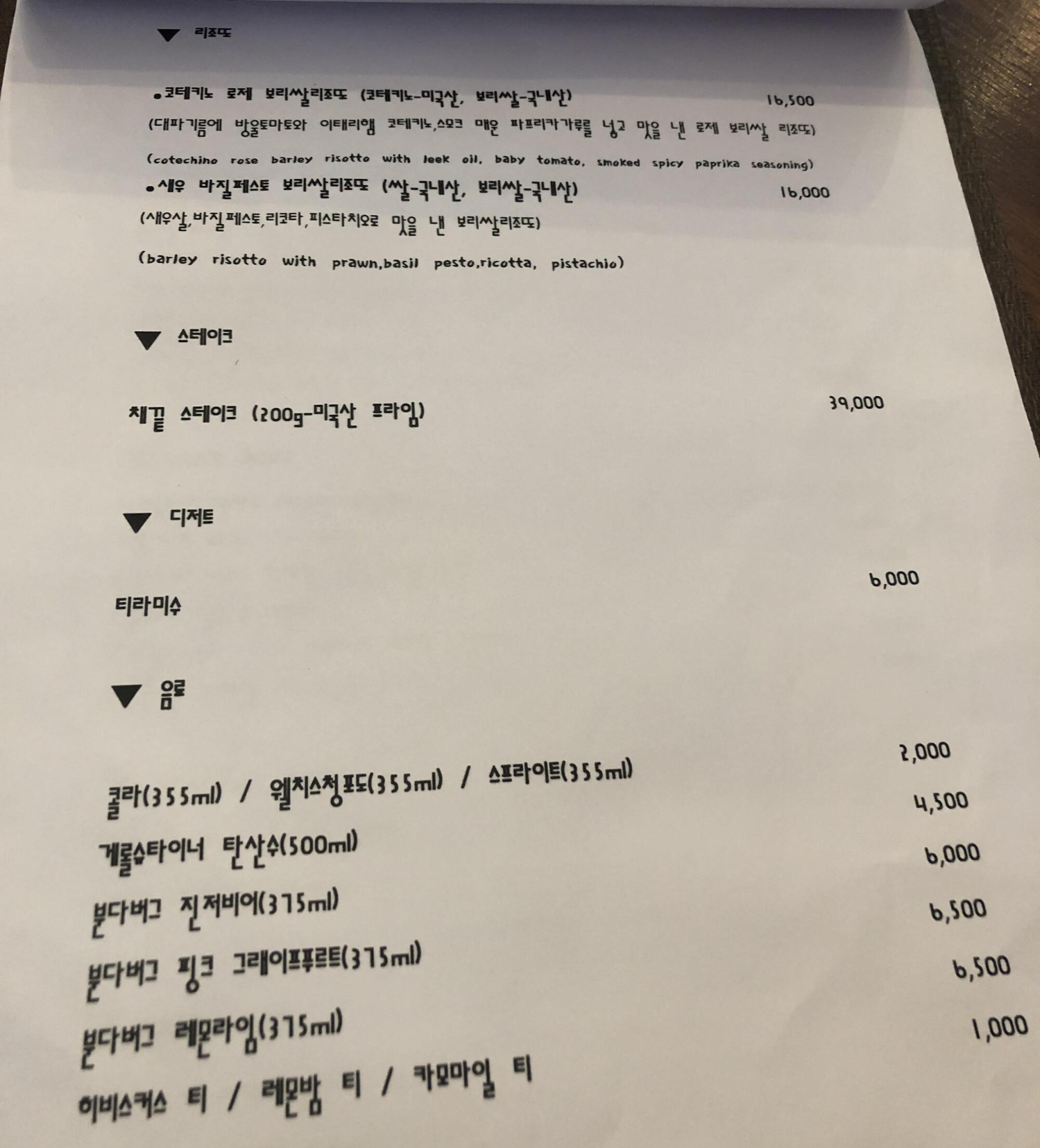 리조또 종류는 2개고 모두 보리쌀 리조또입니다.
