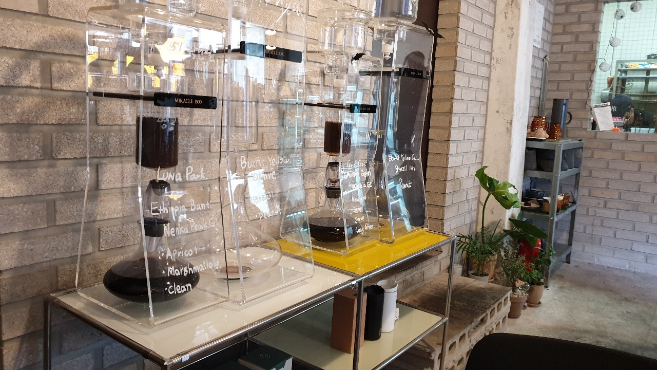 카페 한쪽 편에서는 커피를 내리고 있었는데 한 방울 한 방울 떨어지는 게 잘 모르지만...콜드브루가 아닐까 싶습니다...