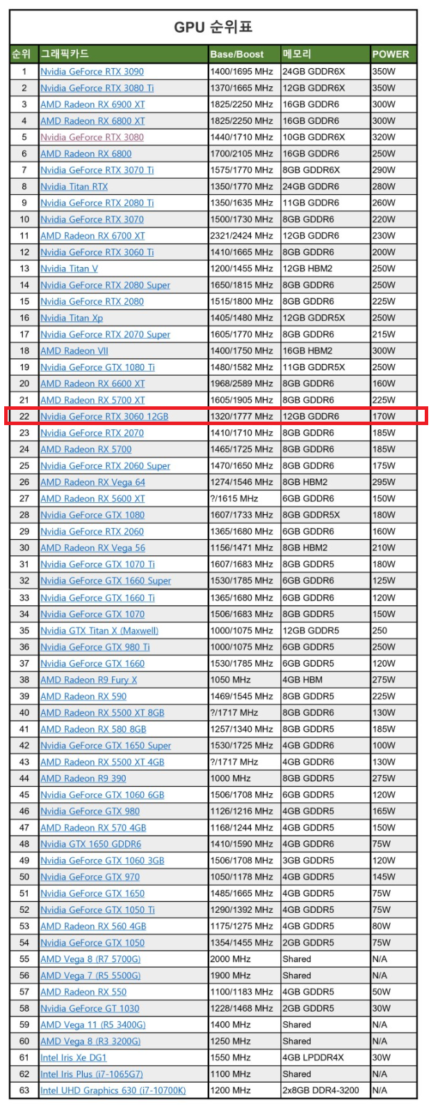 Nvidia RTX 3060 12GB 가 22위 정도에 랭크한것을 확인 할 수 있습니다.