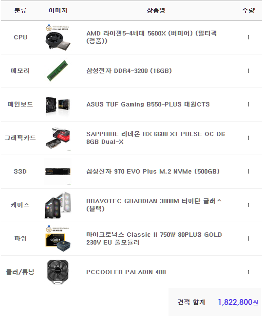 총비용이 대략적으로 180만원 정도로 구성한 사양입니다.
