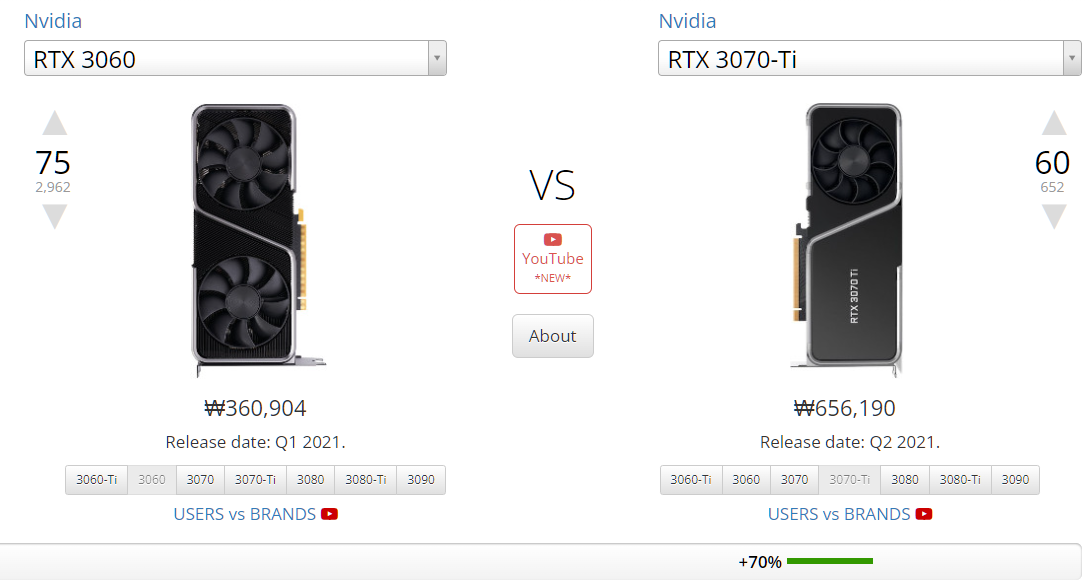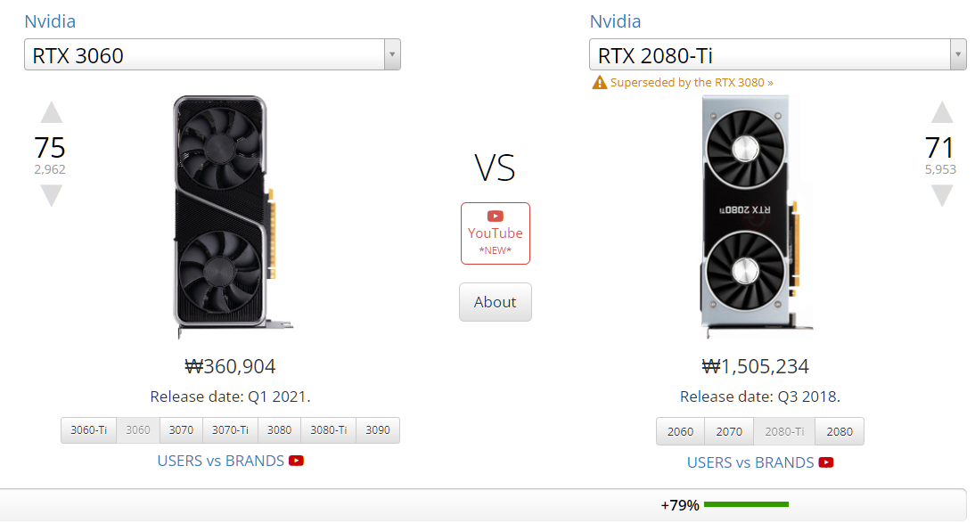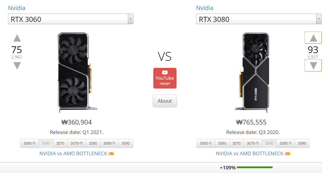 TMI [ 그래픽 카드 사양별 성능 비교 3060 ≤ 6600XT < 3070 < 3070ti ≤ 2080ti < 3080 ]