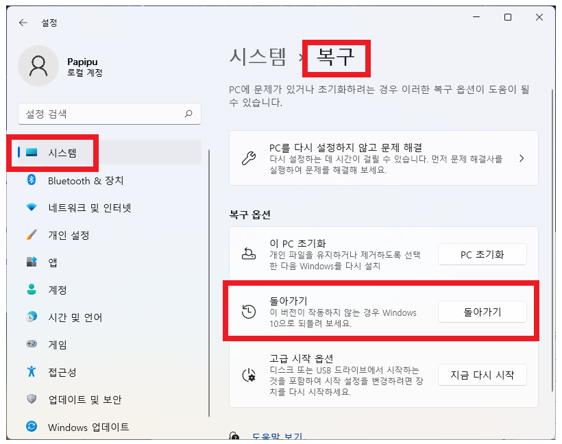 다른 방법으로는 업데이트 메뉴 ▶ 고급설정 ▶ 복구에도 동일한 내용이 있으니 참고 삼아 말씀드려요~