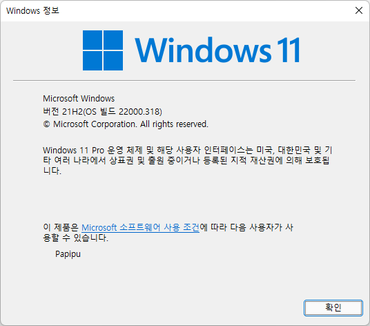 검색창에서 winver 검색하시면 Windows 11 버전 21H2로 변경된 것을 확인하실 수 있습니다.