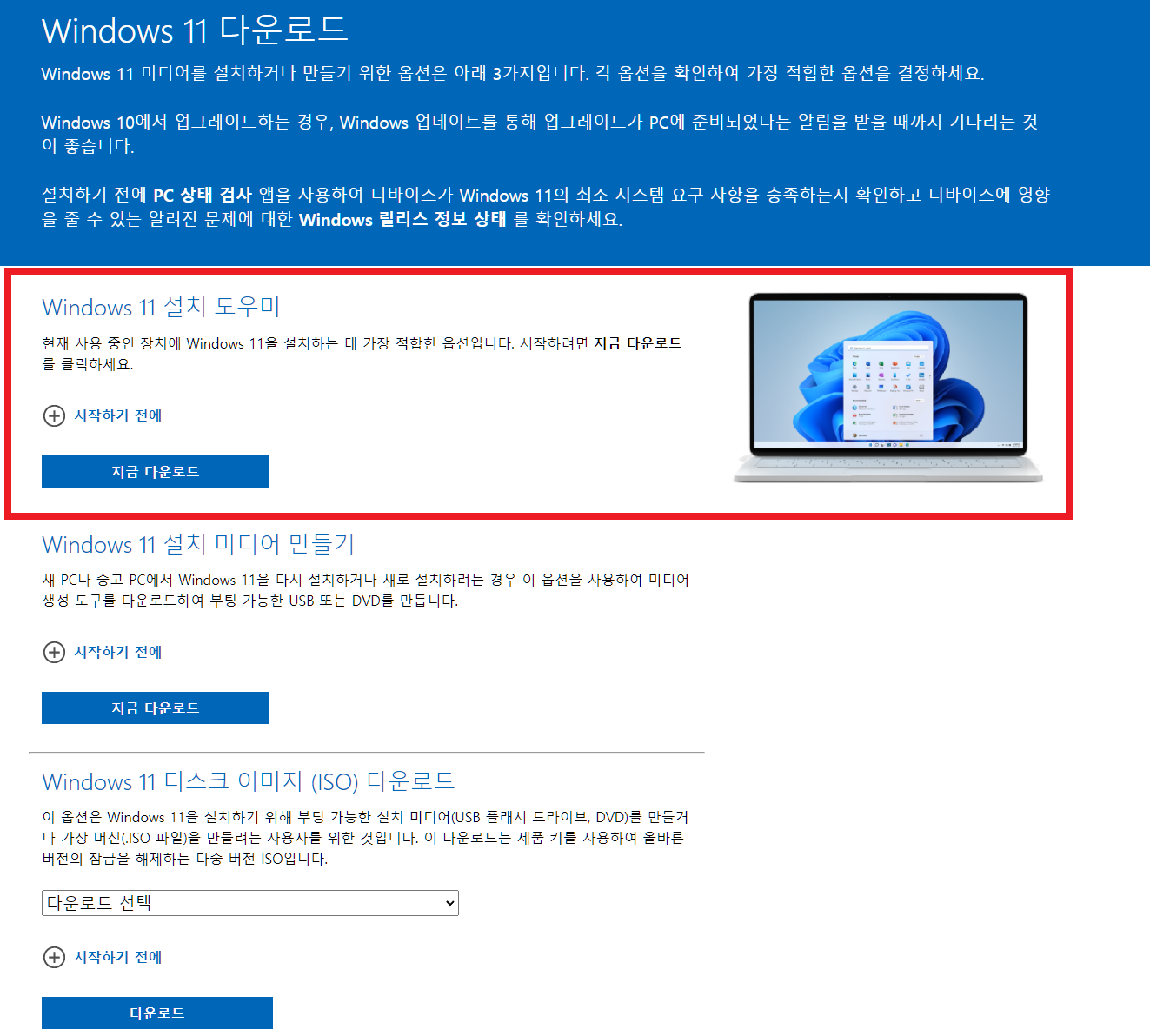 아래 링크에 접속하시게 되면 윈도우11로 업데이트를 도와줄 어시스턴스 프로그램을 다운로드하실 수 있습니다.