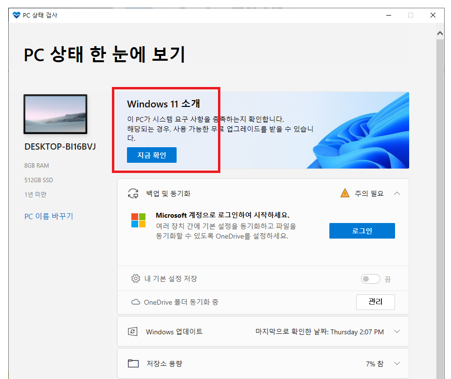 어떤 부분이 필요한지 PC 상태 검사 앱을 통해서 확인할 수 있습니다.