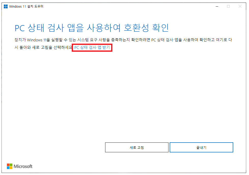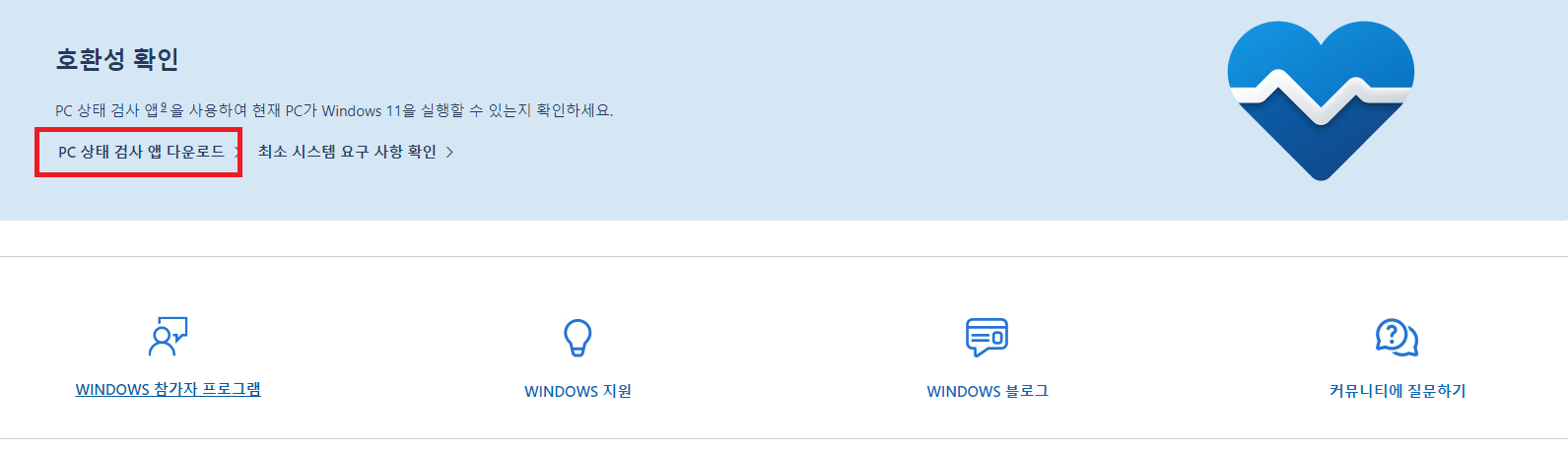 상태 검사 앱 받기를 누르시면 아래와 같은 창이 나타납니다. 여기서 'PC 상태 검사 앱 다운로드'를 클릭해주세요.