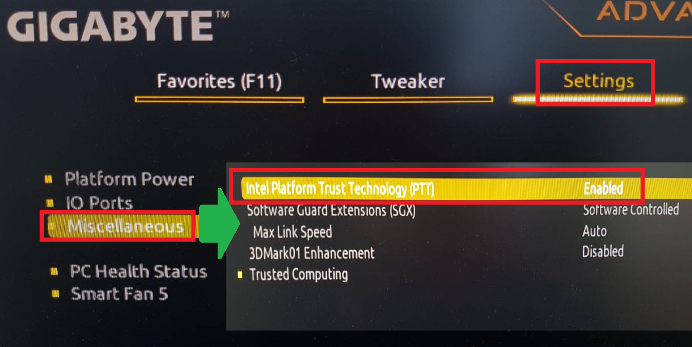 Advanced - Settings - Miscellaneous - Intel Platform Trust Technology (PTT) 기능 Disabled → Enabled로 바꿔주세요. 그리고 F10을 눌러 저장해주세요.