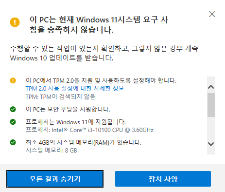 제가 사용 중인 pc에서는 윈도우11로 업데이트하기 위해서 TPM 2.0 지원 기능이 부족하네요.