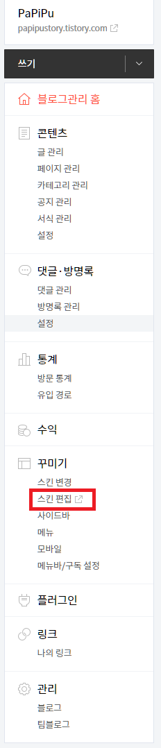 [꾸미기 메뉴의 스킨 편집을 클릭해주세요.]