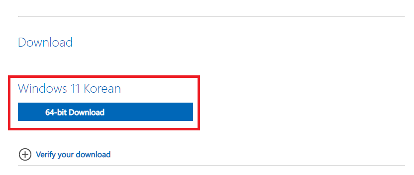 그럼 마지막으로 Download 메뉴가 보이고 Windows 11 Korean '64-bit Download' 클릭해주시면 ISO 파일 다운로드가 시작됩니다.