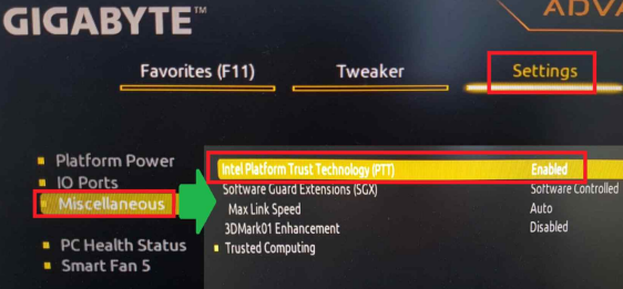 Advanced - Settings - Miscellaneous - Intel Platform Trust Technology (PTT) 기능 Disabled → Enabled