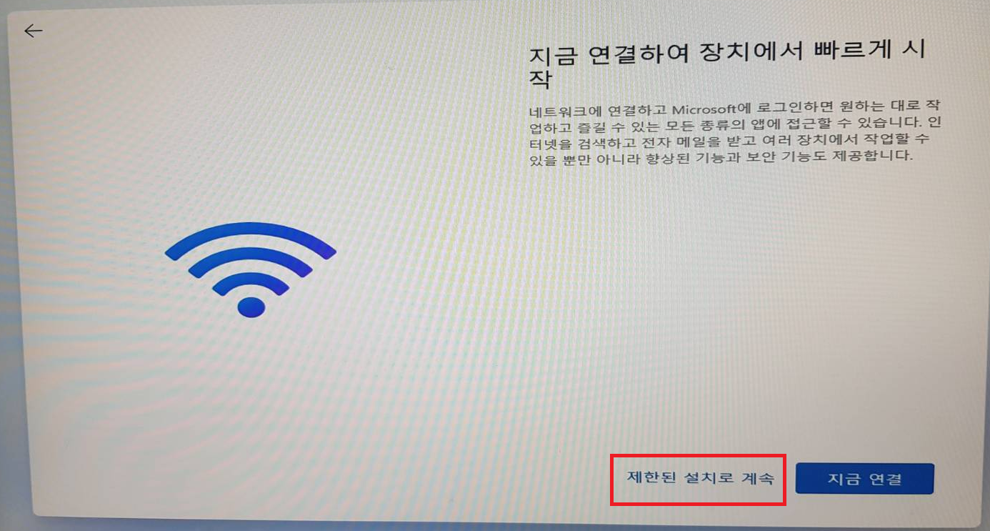▶[제한된 설치로 계속] //연결로 하시면 마이크로소프트 계정 입력으로 번거로워질 수 있습니다.