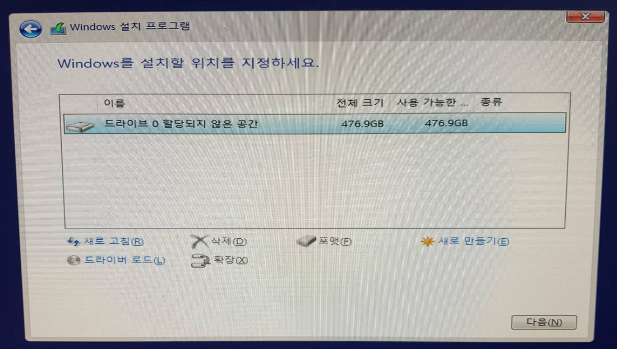 ▶ 6) [설치를 원하시는 드라이버 선택] //깨끗하게 설치를 원하시면 파티션 정리가 필요합니다.