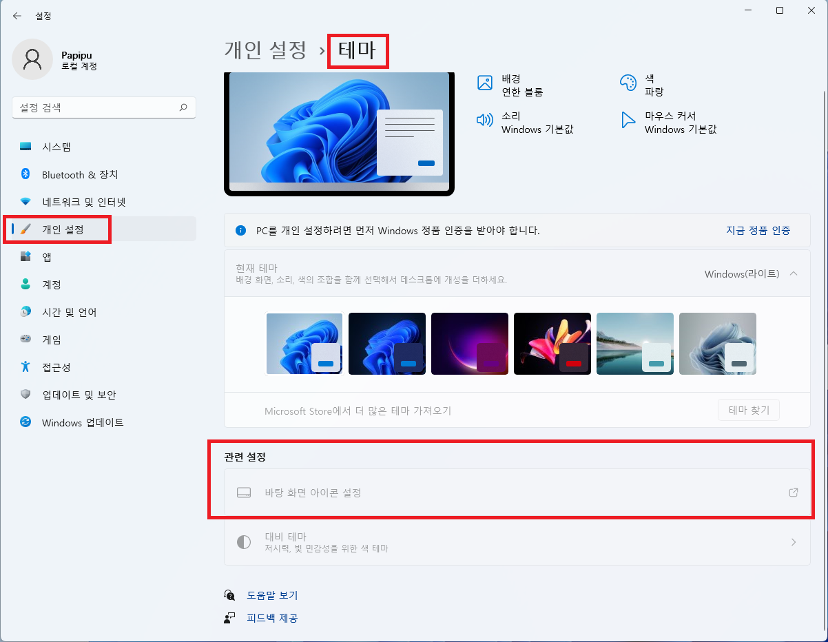 윈도우11에서는 정품인증을 마쳐야지만 개인설정 변경이 가능합니다.