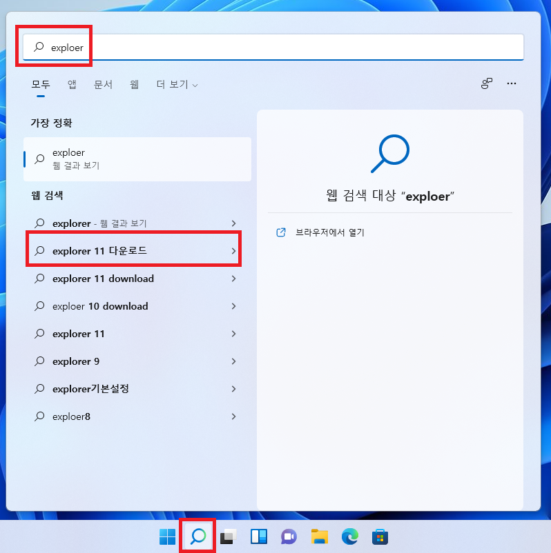 윈도우 검색창에서 'explorer 11 다운로드'를 입력해도 웹 검색을 해줍니다.