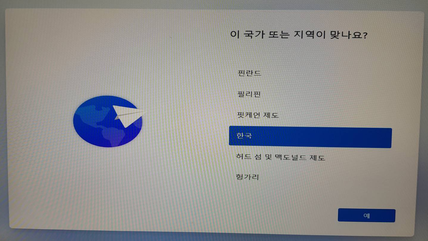 이제 국가, 유저명 등 몇 가지 윈도우11 설정 과정만이 남았습니다.