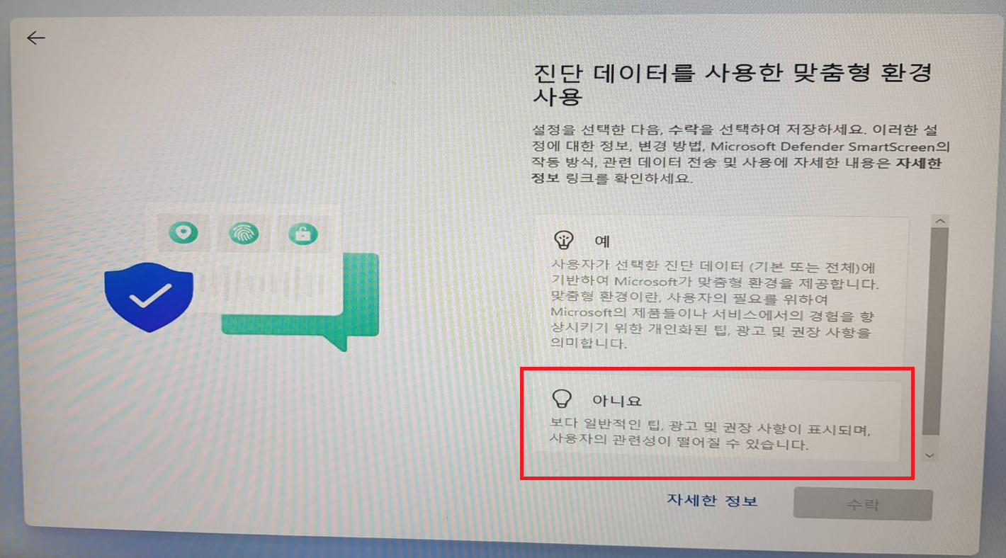 ▶[진단 데이터를 사용한 맞춤형 환경 사용] //제공했던 요소들을 MS에서 설정 변경하는 내용입니다. 아니요!!!!