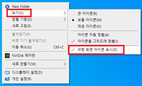 메뉴창에서 보기 - 바탕 화면 아이콘 표시