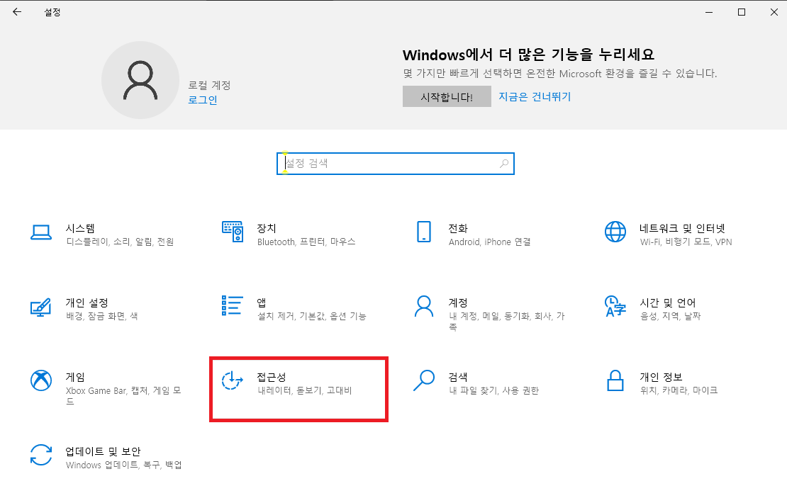 다음과 같은 설정창이 열리면 '접근성' 항목을 클릭해주세요.