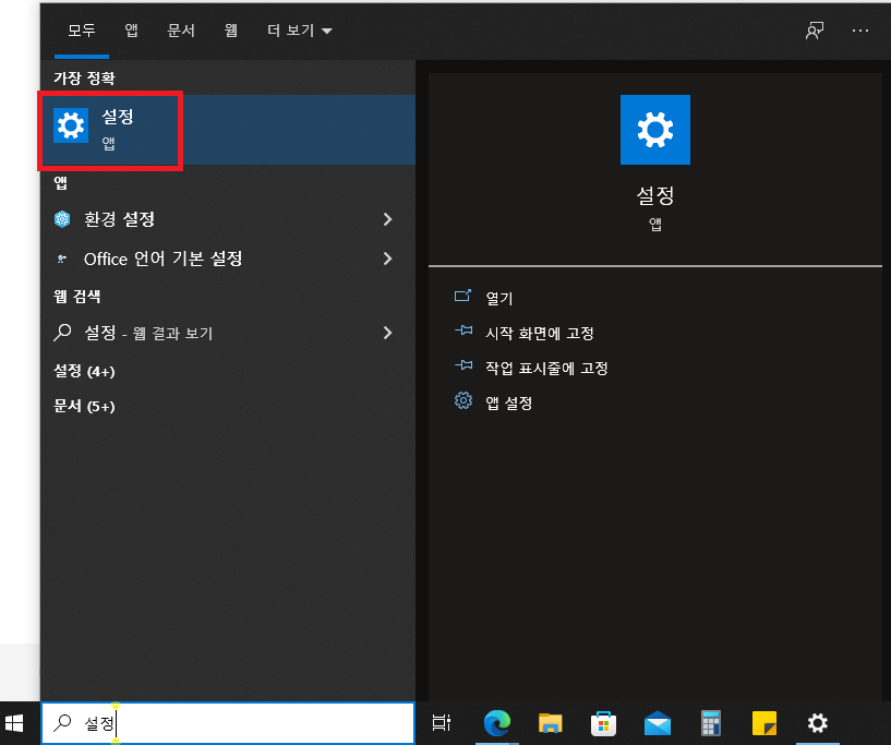 '설정' 검색을 하시면 설정 앱이 검색됩니다. 실행시켜주시면 됩니다.