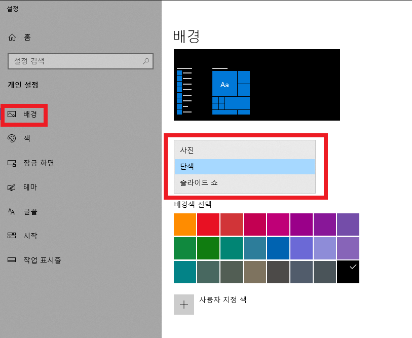 개인 설정 창에서 배경 - 단색으로 선택