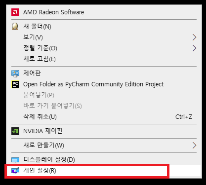 1번 설정 항목에서 '개인 설정' 또는 바탕화면에서 마우스 우클릭 후 제일 아랫부분의 개인설정 창을 열어줍니다.