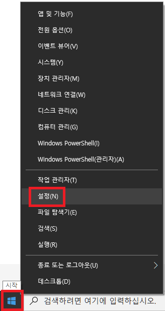 (2) 윈도우 로고(시작 버튼)를 '마우스 우클릭'하시면 아래 사진과 같은 메뉴창이 열립니다.