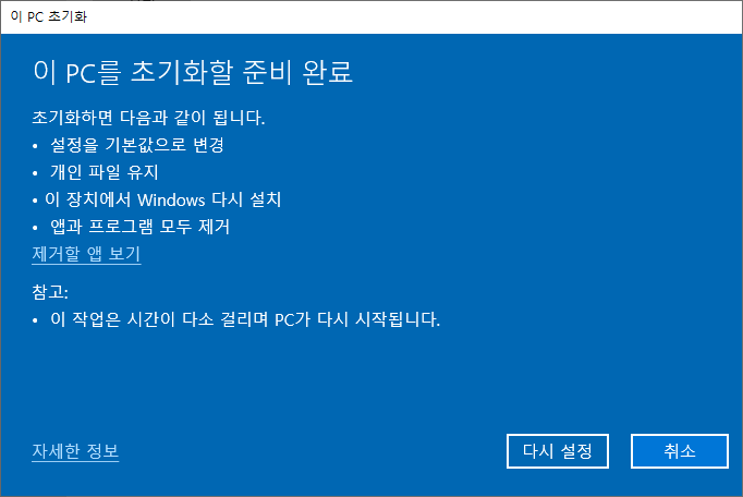 여기서 다시 설정을 누르시면 이제 초기화가 진행됩니다.