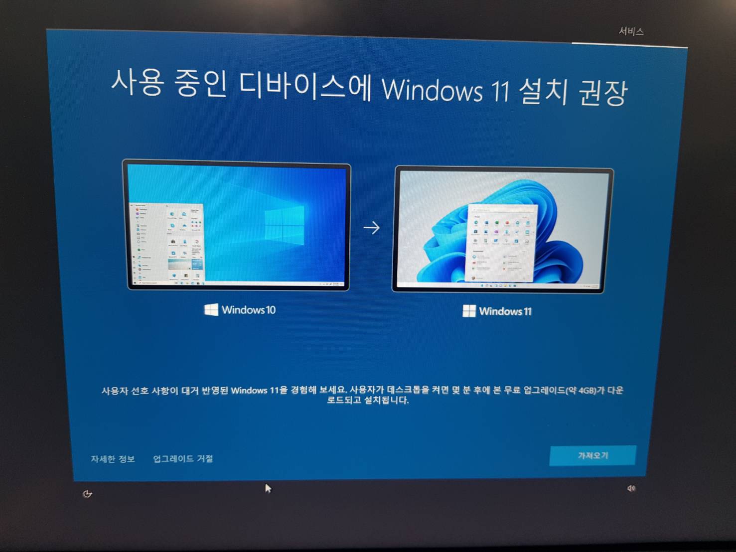◈Windows 클라우드 다운로드를 선택하시고, Windows11 설치 권장되는 사양을 사용 중이시라면 Windows11 설치를 권장하는 화면이 나타나게 됩니다. 설치하고 싶으시지 않으시다면 좌측 하단에 업그레이드 거절을 클릭해주세요.
