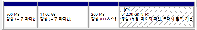 UEFI 방식으로 윈도우가 정상적으로 설치되었다면 위와 같이 'EFI 시스템 파티션', '기본 데이터 파티션', '복구 파티션' 3개가 설치되어 있습니다.