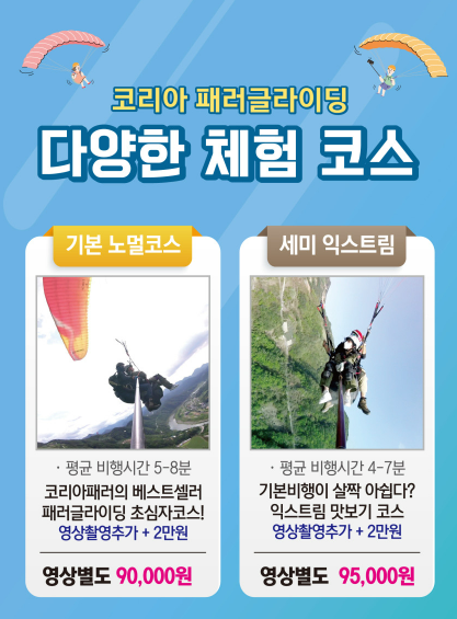 패러글라이딩의 경우 성수기에는 미리 예약을 추천드리기 때문에 일정 시간에 맞추어 선후를 선택하시면 됩니다.