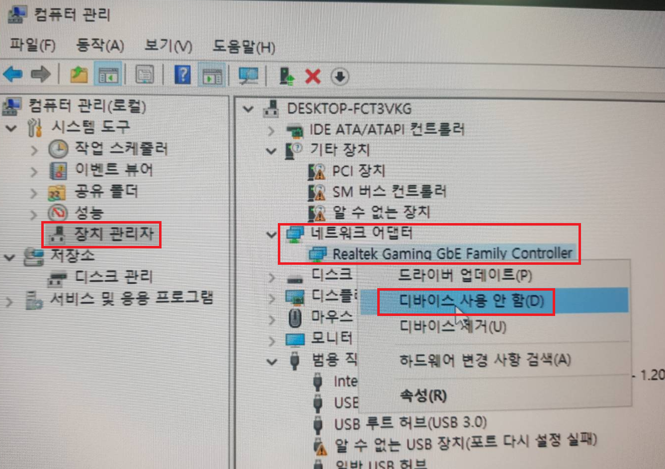 (4) 컴퓨터 관리창이 뜨고 장치 관리자 - 네트워크 어댑터 - 우클릭(디바이스 사용 안 함)