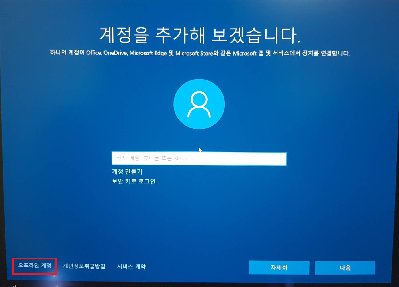 윈도우 설치시 많은 분들이 깜빡 잊고 인터넷(Lan) 케이블을 연결한 상태로 윈도우 MS 사용자 로그인 화면으로 진입합니다.