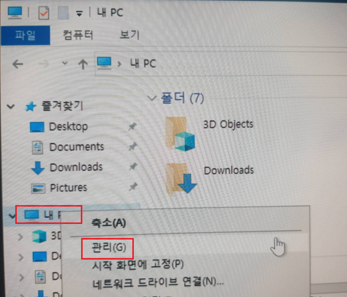 (3) 탐색기 창이 열리면 좌측 메뉴 내컴퓨터 우클릭 - 관리 메뉴를 선택합니다.