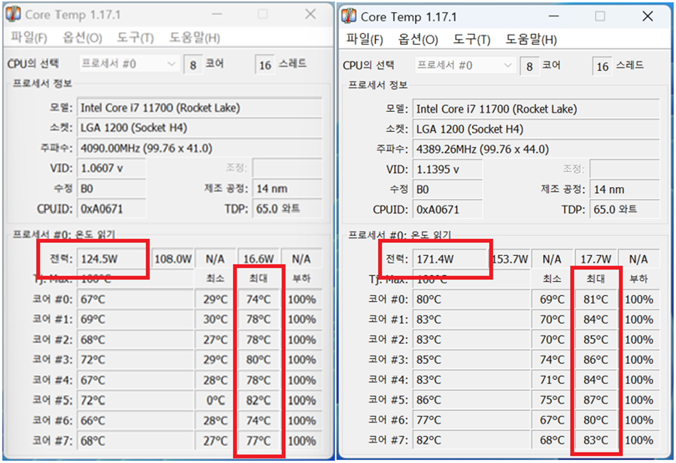 | CPU 온도 | 약 30도 | 약 70 도 (최대 82도) | 약 70 도 (최대 82) |